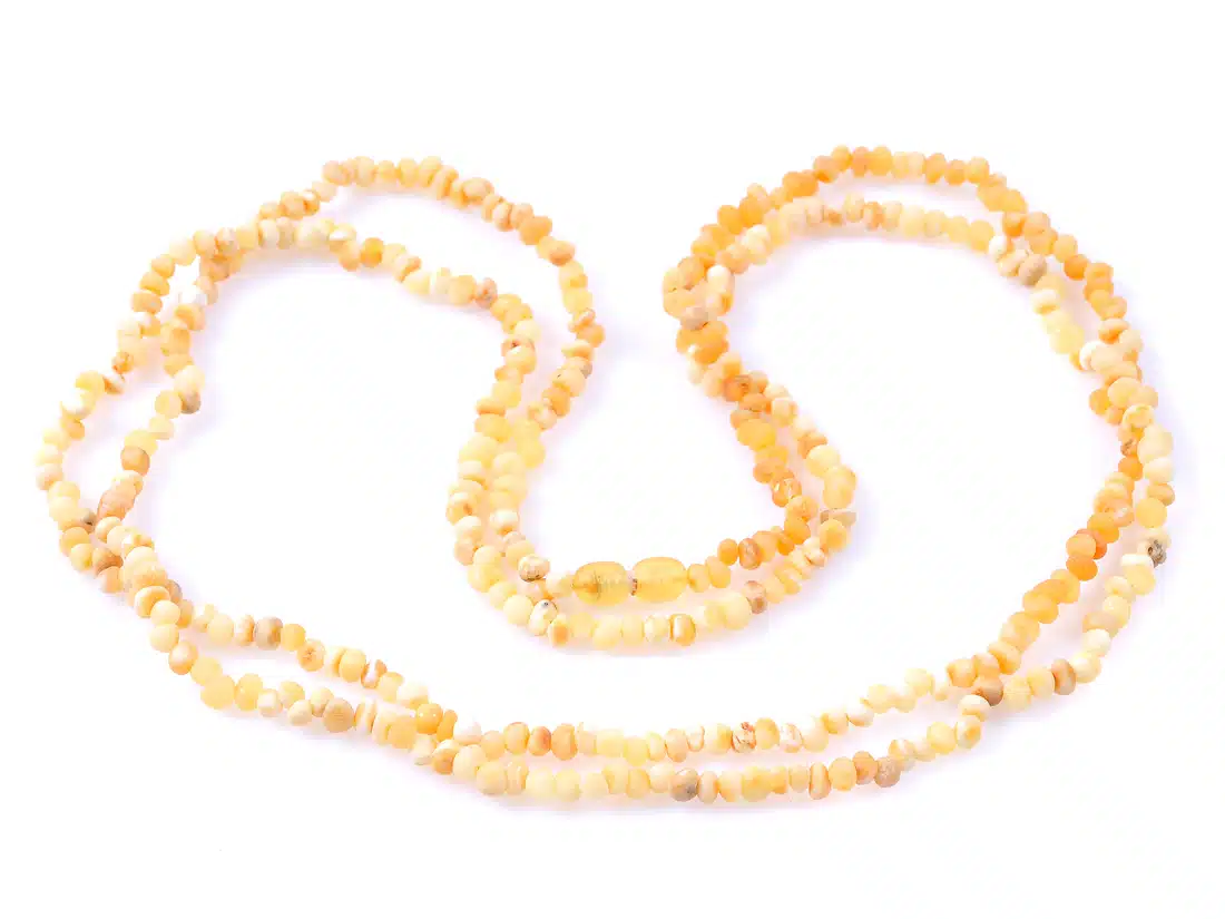 Дълго колие изработено от от заоблени малки кехлибаречета суров кехлибар с гладка повърхност.