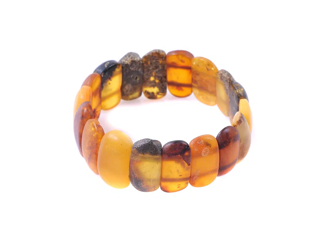 Кехлибарената гривна е от заоблени плочки полиран кехлибар в различни нюанси.