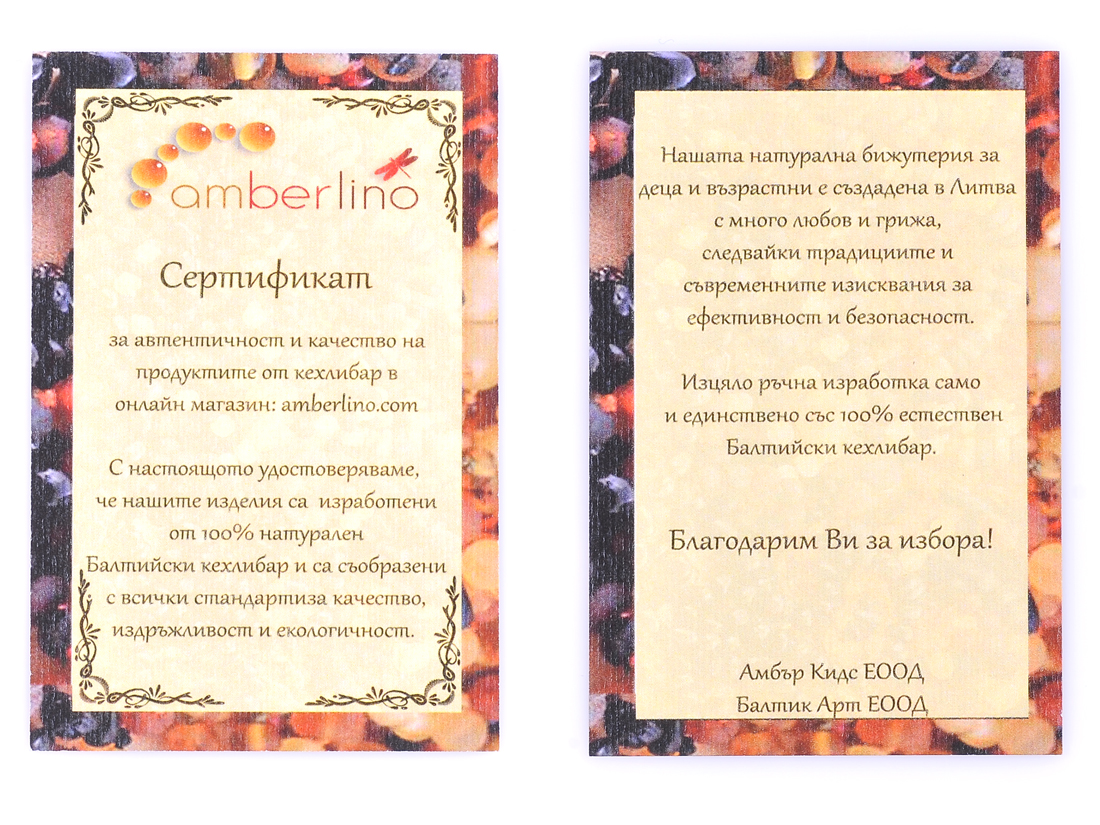 При употреба избягвайте козметика и парфюми, масла и други продукти. Кехлибарът е 100% естествен продукт и са възможни са леки отклонения в нюансите, формите и прозрачността. Пазете от удари, изтърване върху твърди повърхности и надраскване от твърди предмети. Съхранявайте в оригиналната й торбичка. Мийте при необходимост с топла вода. При силен удар или натиск е възможно да се отчупят парченца.