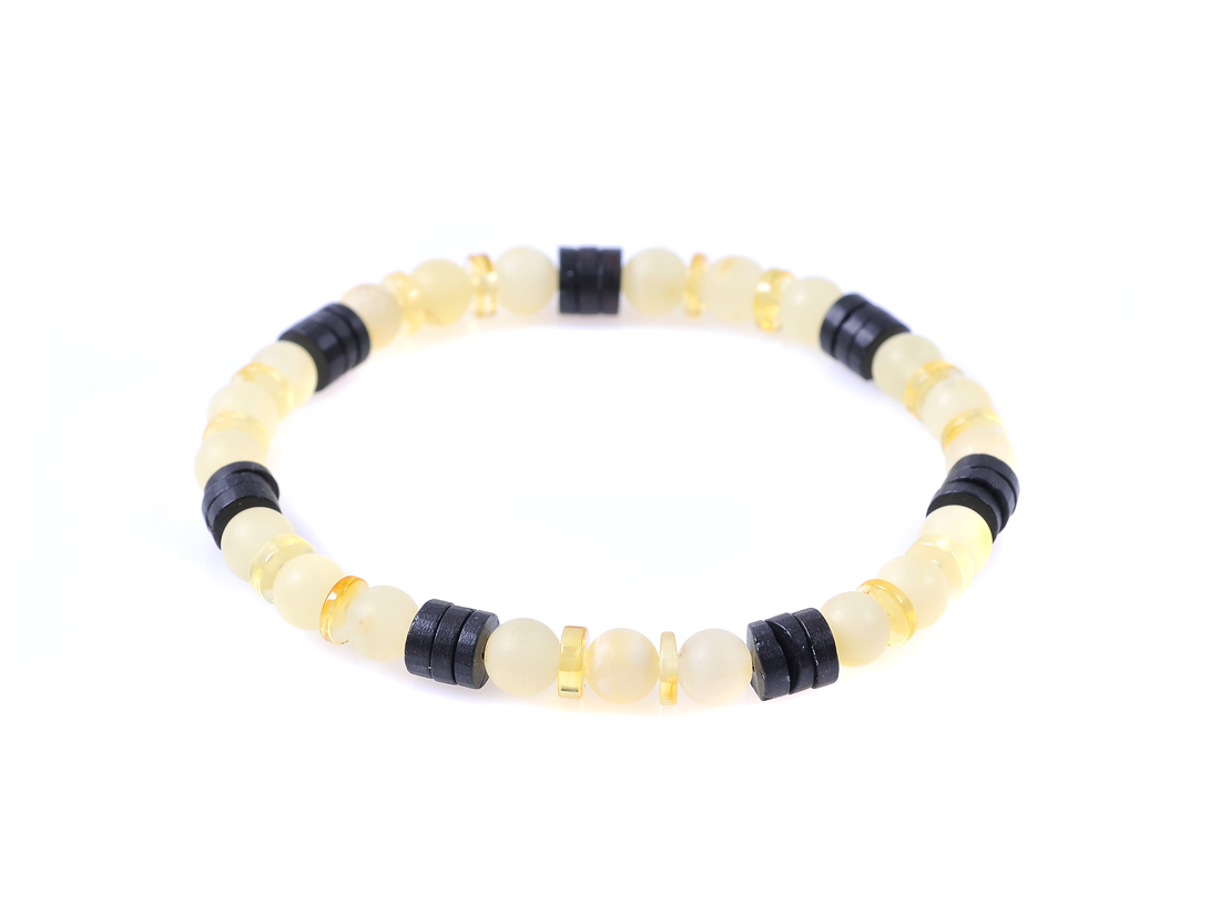 Фина гривна суров кехлибар, ръчно изработена от неполирани изящни кехлибарени топчета и шайби в два контрастни цвята:  светъл заскрежен лимон и черен. Кехлибарените топчета са с матова повърхност без блясък и прозрачност. Шайбите в цвят прозрачен лимон са полирани за малко бляскав елемент.