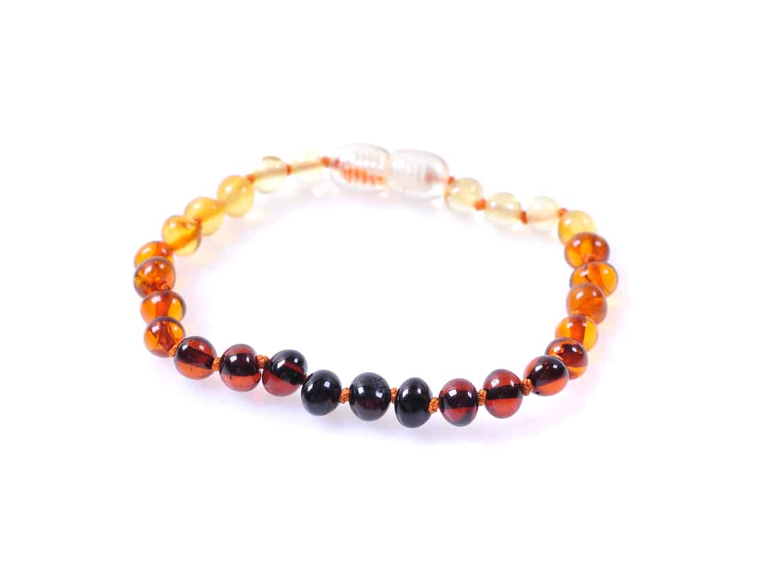 Дамска/тийн гривна полиран кехлибар тип топчета - овални кехлибарчета, подредени да се преливат от лимонено жълто през светъл и тъмен мед и коняк до черна череша.