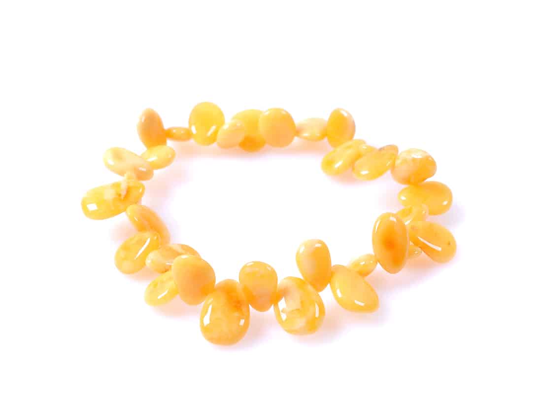 Листенца кехлибар в цвят крем карамел - дамска гривна полиран кехлибар във форма на малки листенца в кремавобял кехлибар с карамелови оттенъци и нюанси, почти без прозрачност. Цветът е нееднороден, топящ се, преливащ в нюанси и тонове близки до бяло, восък, кремаво. Изключително, нежна женствена гривна.   Дължина 18 см, еластична, размери на листенцата: 10-15 мм.