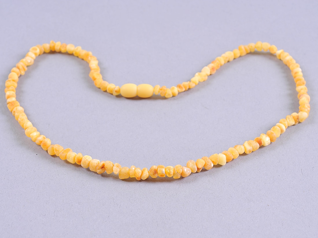 Нежна дамска огърлица от малки фини заоблени кехлибарени парченца с гладка матова повърхност в светли нюанси - крем, лимон, бял.