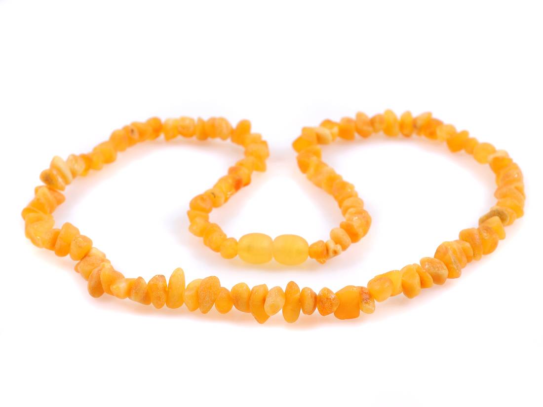Нежна огърлица цвят восък от малки, заоблени кехлибарчета. Кехлибарът е с гладка, матова повърхност, от парченца необработен кехлибар в нееднородна форма.