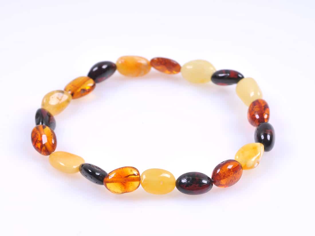 Гривна кехлибарен микс за дами и девойки от натурален полиран кехлибар в четири основни цвята - бял, мед, коняк и череша. Бижуто е изработена ръчно от гладки, плоски и лъскави кехлибарчета във форма на бобчета. Кехлибарената гривна е еластична с дължина около 17-18 см. Дължината на кехлибарените бобчета е около 10 мм. Изключително лека и приятна за носене гривна, особено подходяща за ежедневието.
